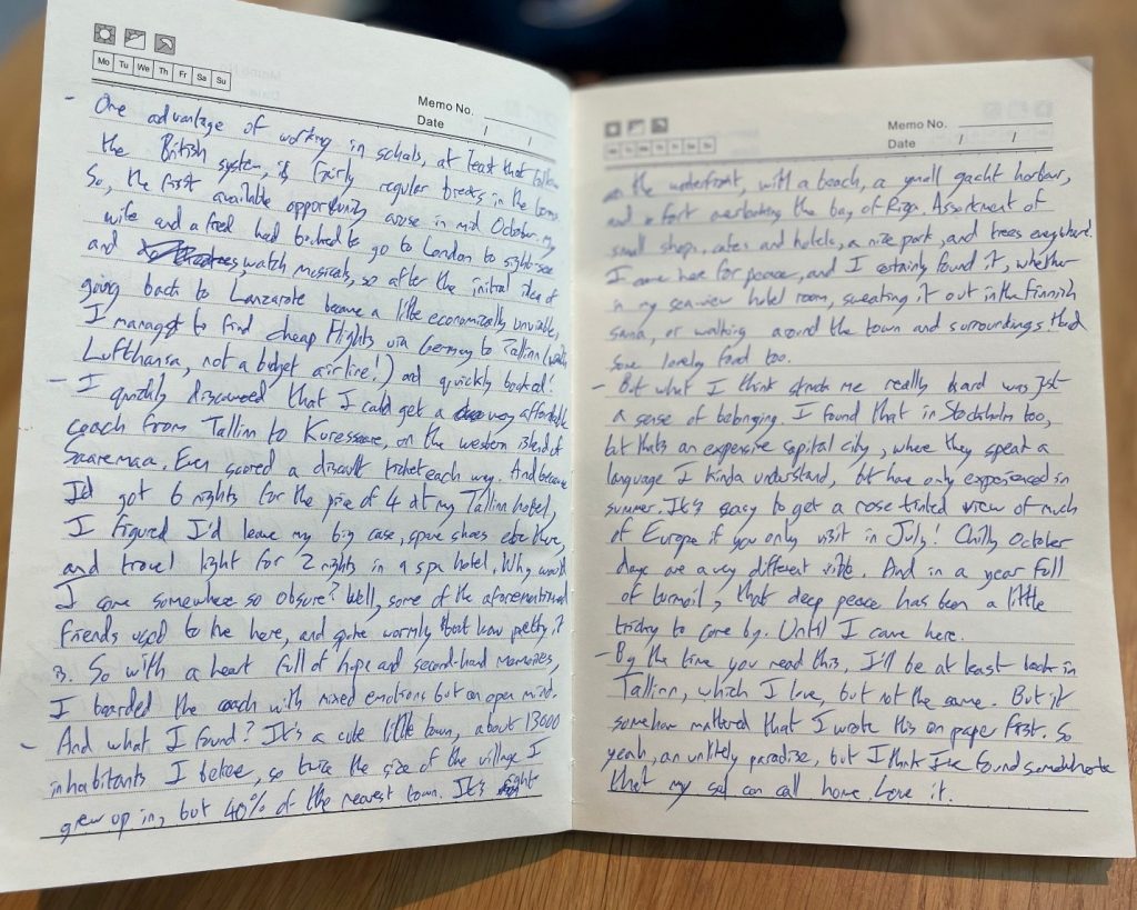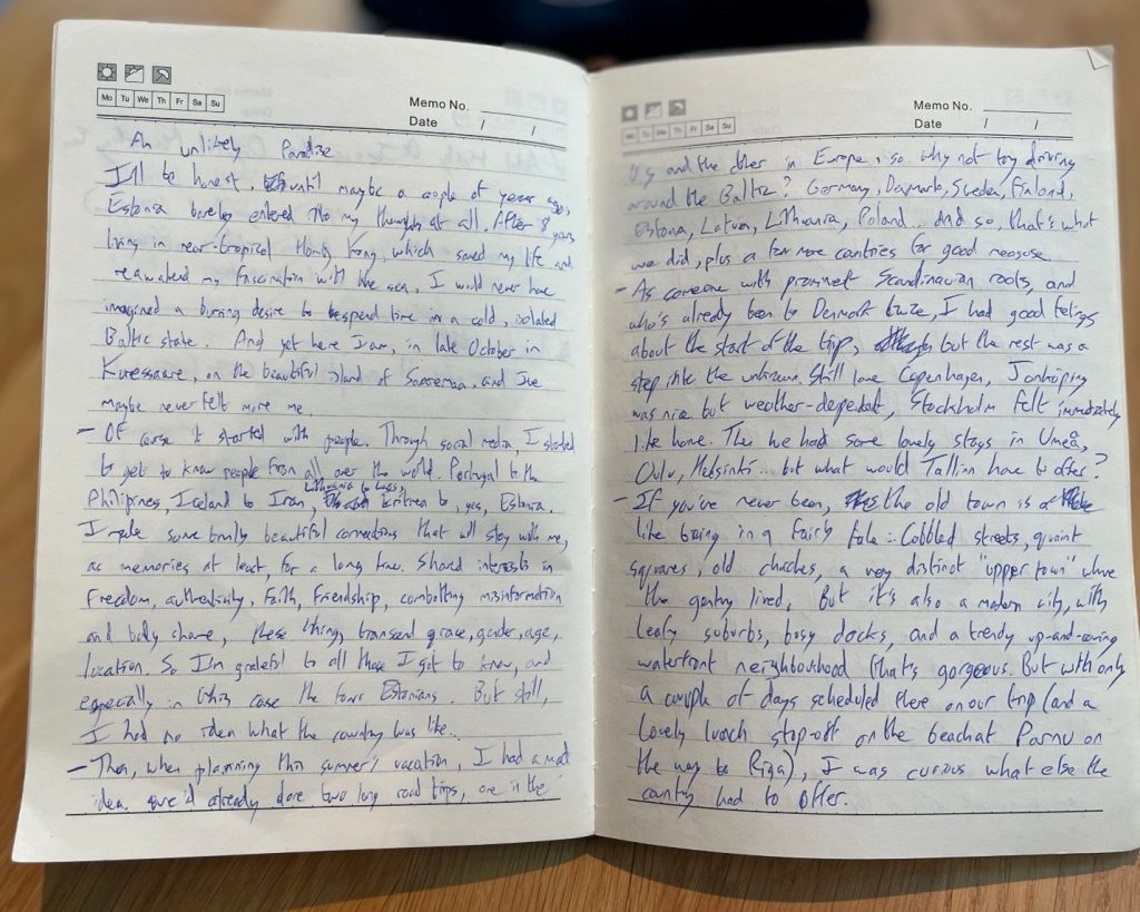By the time you read this, I’ll be at least back in Tallinn, which I love, but not the same. But it somehow mattered that I wrote this piece on paper first. So yeah, an unlikely paradise, but I think I’ve found somewhere that my soul can call home. Love it!